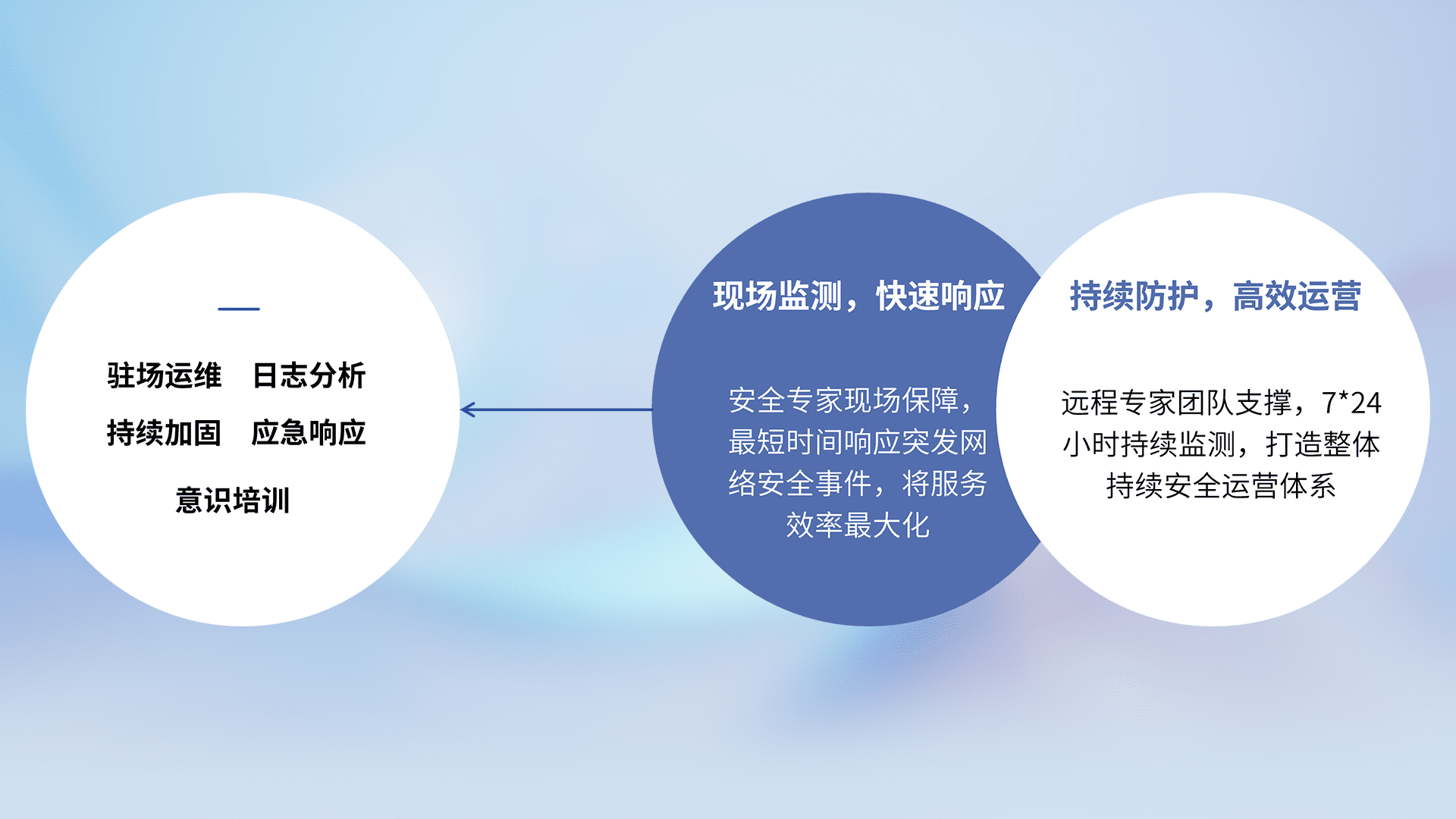7X24小时持续监测安全事件,保持安全策略有效性,降低资产脆弱性风险,,精准拦截黑客攻击,,,减少被黑客利用的机会,,,,第一时间遏制,,降低损失。。